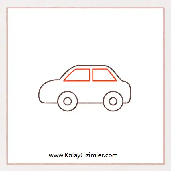 Öncelikle, arabanın ön tamponundan arka tamponuna kadar, tekerleklerin arasından geçen yatay bir çizgi çiz. Sonra, her pencerenin hemen altına, kapı kollarını göstermek için iki küçük kısa çizgi ekle.