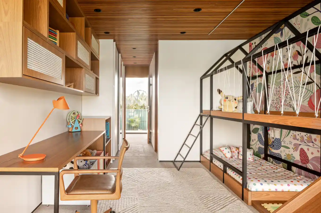 Ahşap panjurların ritmik yerleşimi, evin işlevsel planlamasını yansıtıyor. Yatak odaları ve kapalı mekanlar daha mahrem ve gölgeli bir karakter kazanırken, sosyal alanlar tamamen açılarak bahçeye ve parkın doğal manzarasına engelsiz bir geçiş sağlıyor. Bu panjurların oluşturduğu gölgeler, gün boyunca değişerek her an farklı bir atmosfer yaratıyor.