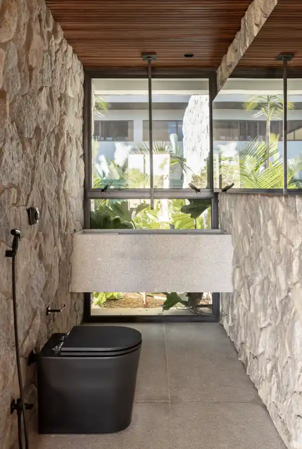 Banyolar ise, taş ve betonun ağırlıklı olarak kullanıldığı, ham malzeme estetiğinin ön planda olduğu mekanlar. Tezgahlar, doğal taş yüzeylerden oluşturulmuş ve lavabolar da yine yekpare taş bloklardan oyularak mekana özgün bir karakter kazandırılmış. Büyük aynalar, banyoları daha geniş ve ferah gösterirken, ince metal çerçeveli cam duş bölmeleri alanın geçirgenliğini artırıyor. Ahşap detaylar, banyo mobilyalarında ve tavan kaplamalarında kullanılarak, taşın soğuk etkisini dengelemiş.