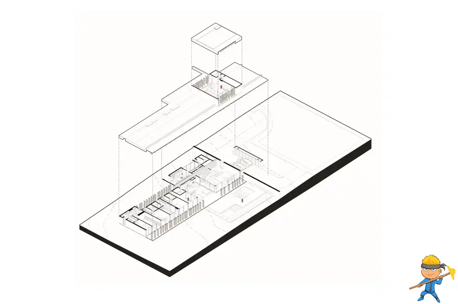 Ev, tüm uzunluğu boyunca uzanan iki ters kirişle desteklenen büyük bir açık beton plak tarafından taşınıyor. Bu kirişlerin üzerine oturan, adeta masif bir kaya gibi duran katı kütlede, evin tek katlı yapısının içinde bir mezzanine olarak yükselen ofis yer alıyor. Bu alan, koruma bölgesine panoramik bir bakış sunuyor.