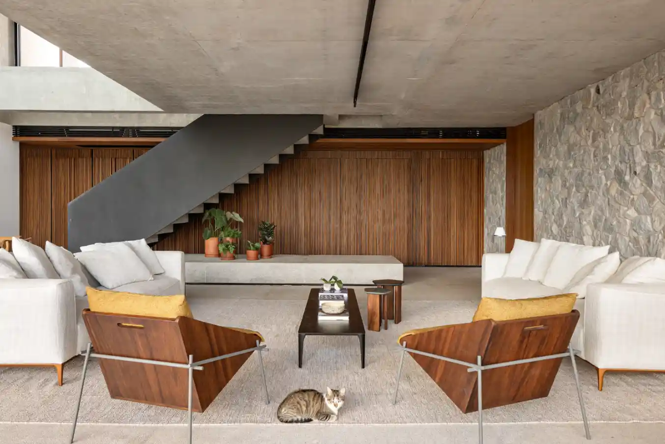 Ev, malzeme seçimleriyle doğayla doğrudan bağ kuruyor. Kullanılan taş, beton ve ahşap gibi doğal unsurlar, dokuları ve renkleriyle doğanın saf formlarını yansıtıyor. Dış ve iç mekanların sınırları taş duvarlarla belirsizleştirilerek, belirli noktalarda iç ve dış mekanın kesintisiz devam etmesi sağlanıyor. Beton, yapının hacmini ve taşıyıcı sistemini oluştururken, modüler düzeniyle yapısal bir rasyonellik sunuyor. Ahşap ise panjurlar, gölgelikler, tavan kaplamaları ve deck zeminlerde yer alıyor. Seçici kullanımı, evin kompozisyonunda malzemeler arasında bir denge oluşturarak, farklı anlarda her birinin kendini öne çıkarmasına imkan tanıyor.