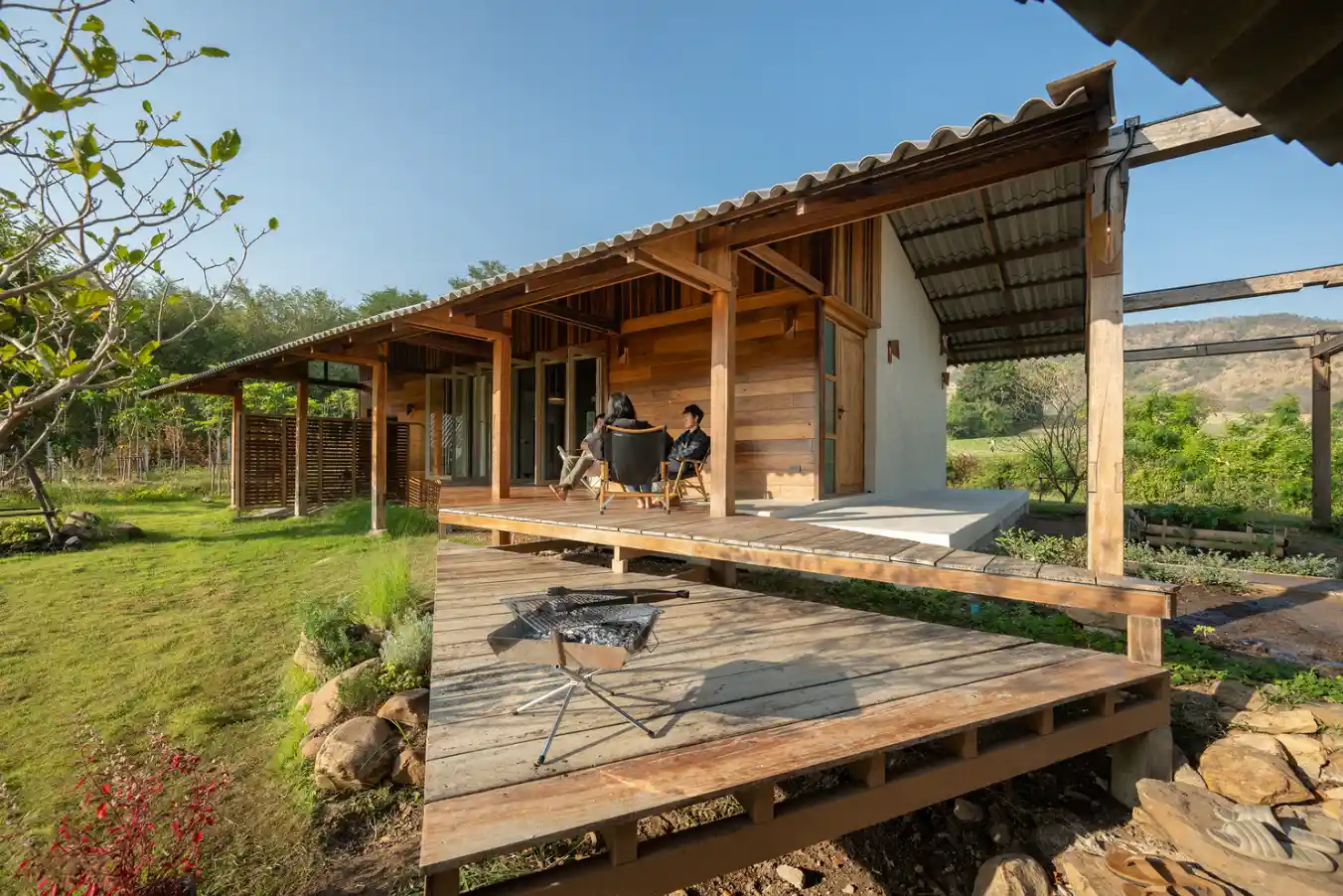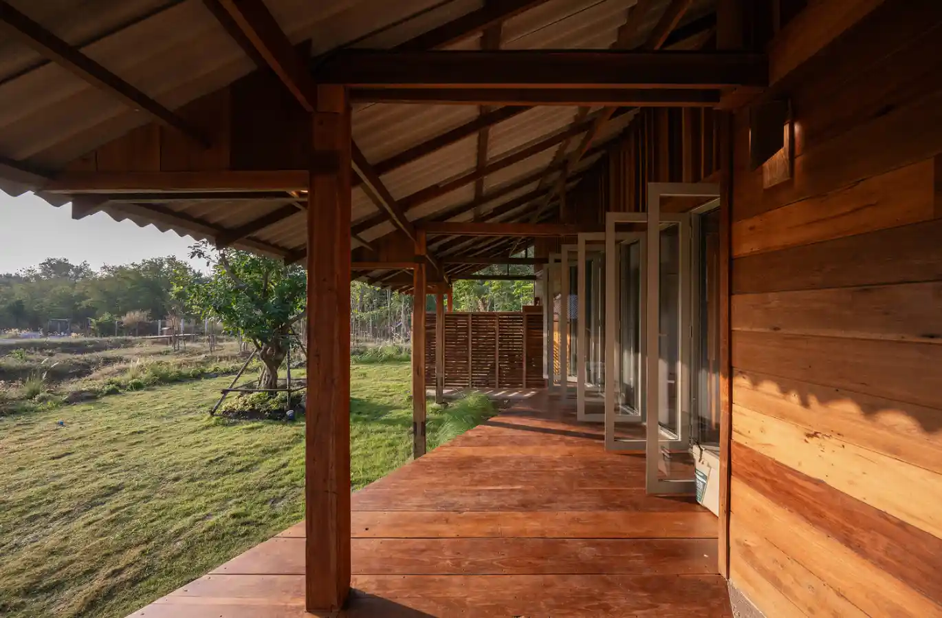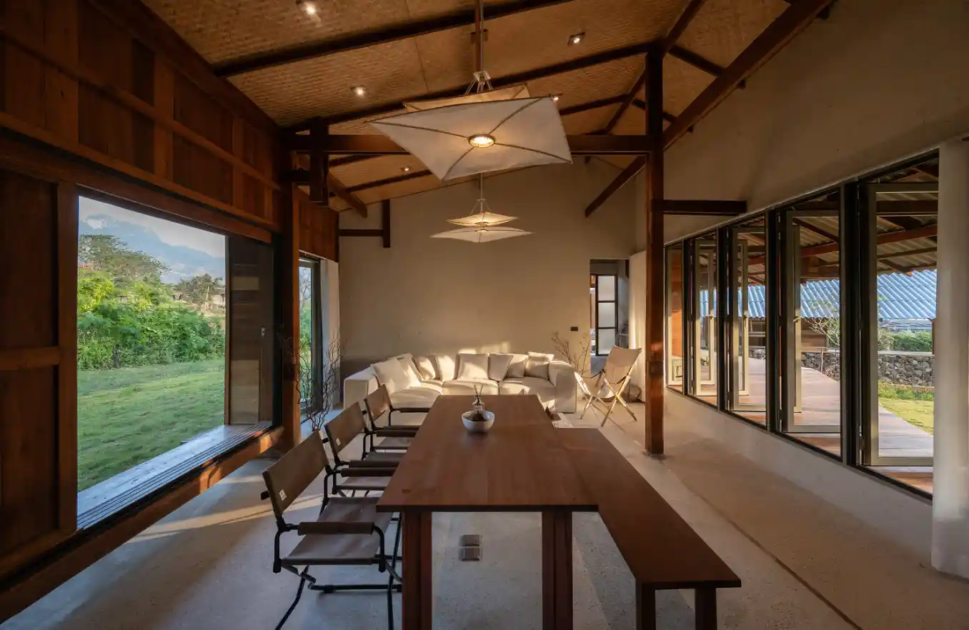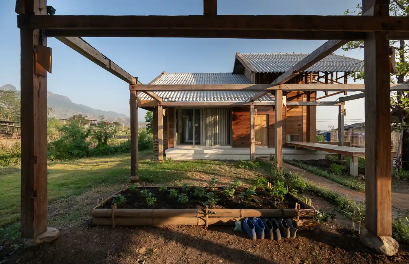 Bu projenin en dikkat çekici yönlerinden biri, geri dönüştürülmüş malzemelerin kullanımıdır. Bölgedeki eski ahşap yapıların korunması zor olduğundan, proje ekibi Chiang Mai’deki üç eski evi sökerek, bu yapıların malzemelerini yeni bir düzende bir araya getirmiştir. Ahşap malzemeler, önceki kullanımlarından kalan izleri koruyarak, yapıya hem tarihsel bir kimlik hem de doğal bir dokunuş kazandırmıştır. Mobilyalar ve aydınlatma elemanları da stüdyoda özel olarak tasarlanıp üretilmiş, böylece evin her köşesinde el işçiliğinin ve zanaatkârlığın izleri hissedilir hale gelmiştir.