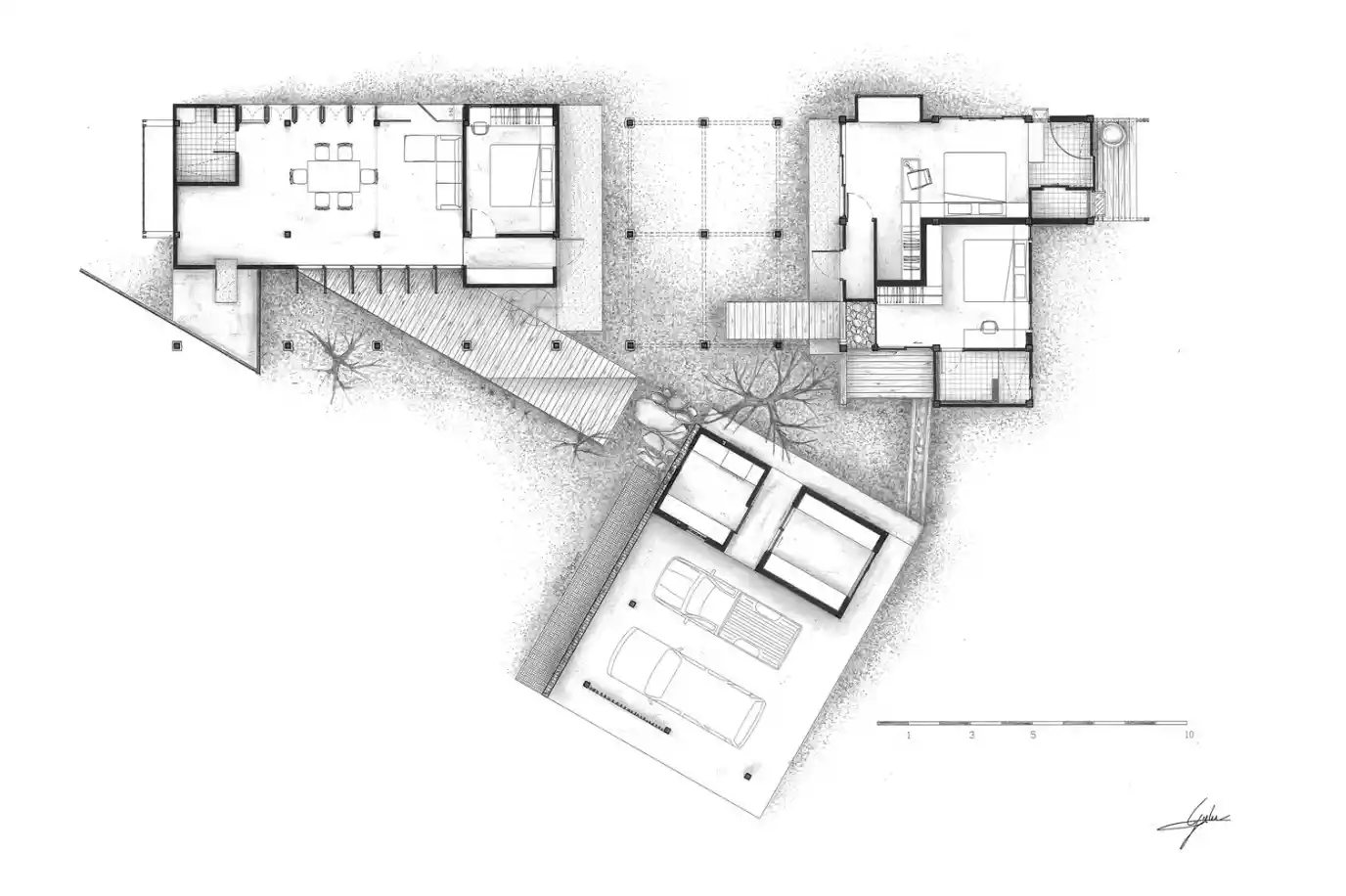 Peyzaj düzenlemesini gösteren çizimler ise su yönetimi ve ekolojik çeşitlilik konusundaki yaklaşımı sergilemektedir. Sai Kai adı verilen kıvrımlı su kanallarının yerleşimi, doğal drenaj sistemini optimize ederken, farklı bitki türlerinin entegrasyonu, doğal dengeyi koruyan bir çevre oluşturmayı amaçlamaktadır. Bu çizimler, yapının sadece bir konut değil, aynı zamanda sürdürülebilir bir yaşam alanı olarak tasarlandığını kanıtlamaktadır.