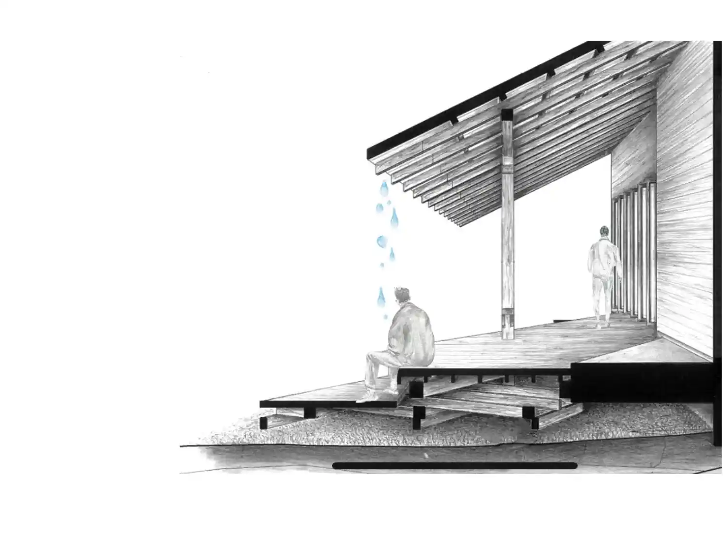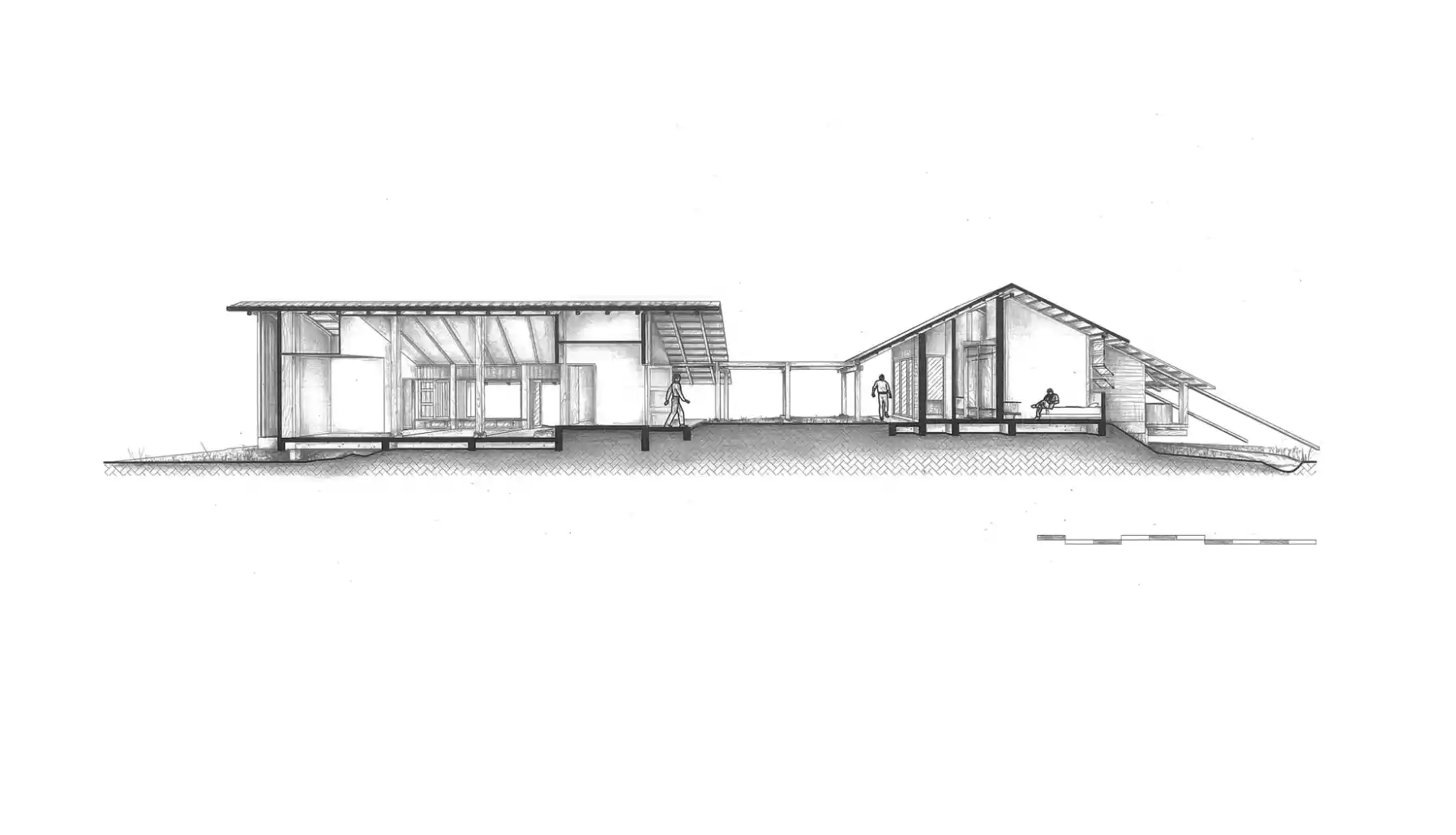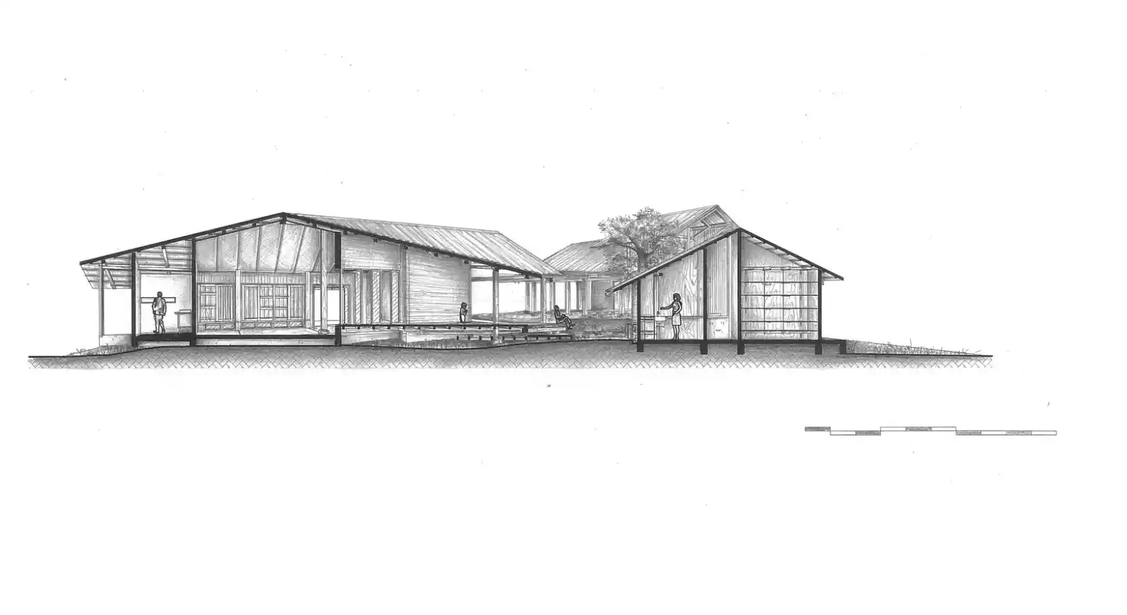 Plan, kesit ve görünüş çizimleri, ahşap kolonların taş temellerle nasıl birleştiğini, iç mekândaki hava akışını sağlayan açıklıkları ve geniş saçakların gölge alanlarını nasıl oluşturduğunu göstermektedir.