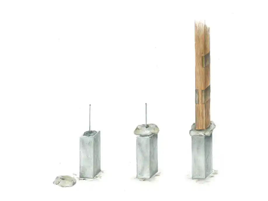 Kesit çizimi, geri dönüştürülmüş ahşap malzemelerin nasıl birleştirildiği ve yapının taşıyıcı sisteminin nasıl güçlendirildiği açıkça görülmektedir. Betonarme ve çelik bağlantılarla desteklenen kolon ve temel birleşimleri, geleneksel yapı tekniklerinin modern mühendislik çözümleriyle nasıl bütünleştiğini vurgulamaktadır.