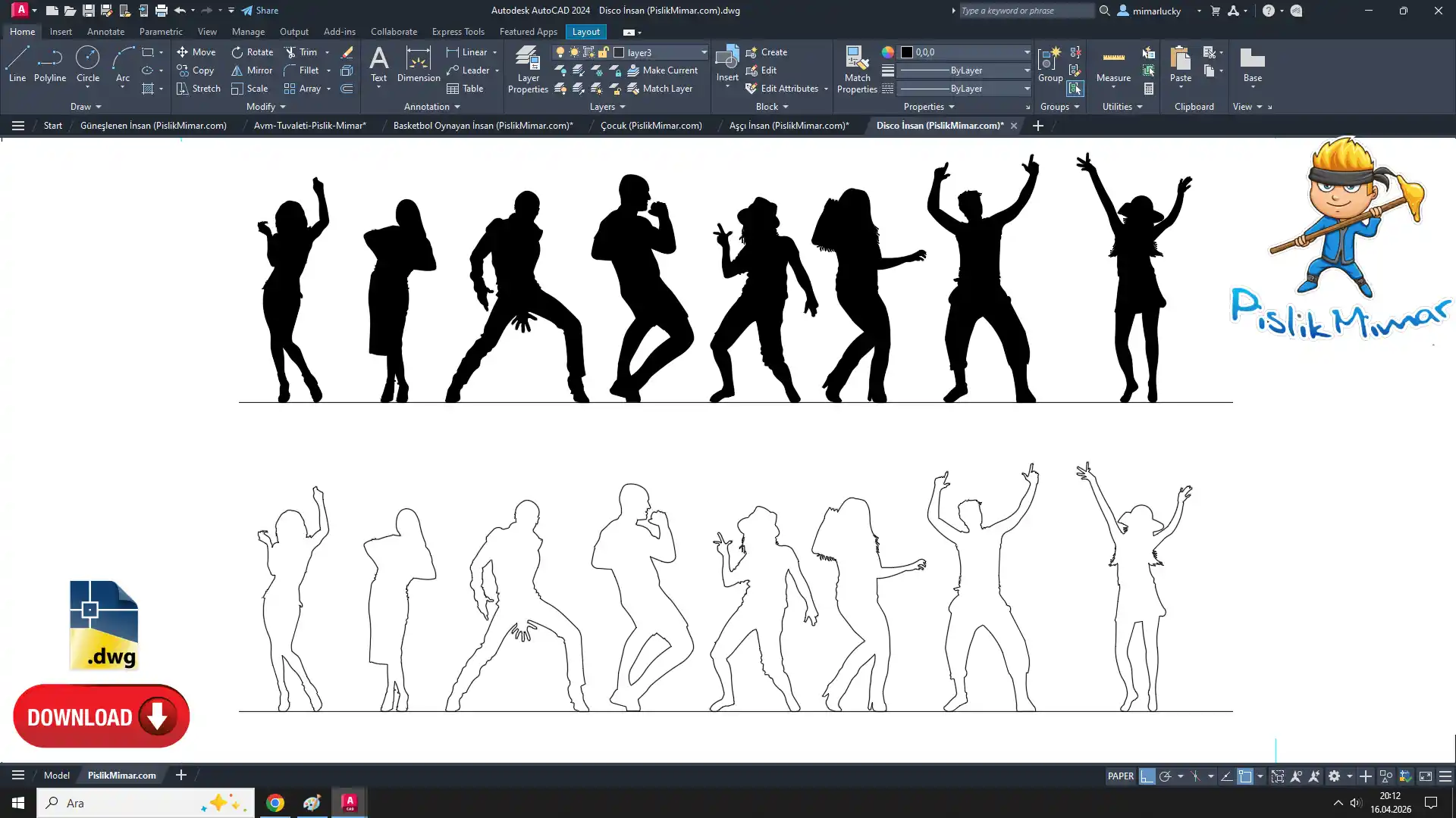 Disko İnsan Dwg çizimini ücretsiz AutoCAD formatında indirin, Disco Human CAD Block free download for AutoCAD. Bu çizimler sayesinde projelerinize kolayca entegre edebileceğiniz detaylı ve ölçekli dans eden insan figürü bloklarına ulaşabilir, tasarım sürecinizi hızlandırabilirsiniz.