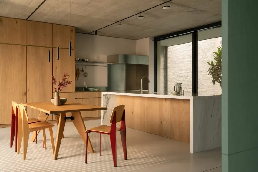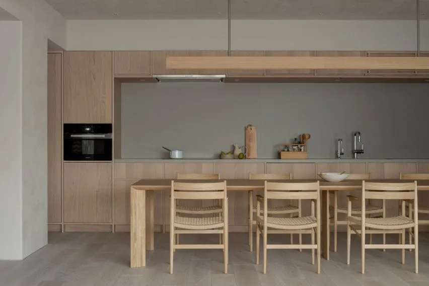 Açık planlı ahşap mutfak tasarımında, mimarın bu daireye özel olarak tasarladığı, örgü oturma yüzeyine sahip bir yemek sandalyesi yer alıyor. Bu sandalye, hem Shaker tasarımlarından, hem de klasik İskandinav sandalyelerinden ilham alarak projelendirilmiştir.