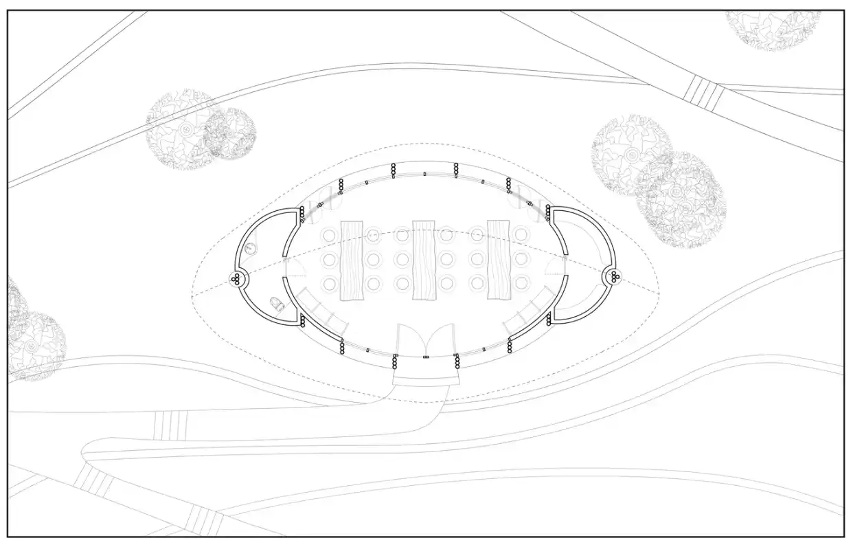 Fish Tail Tea Room’un mimari projeleri, yapının özgün formunu ve işlevsel kurgusunu ortaya koyan detaylı çizimlerden oluşmaktadır. Zemin kat planı, yapının oval ana formunu, giriş-çıkış noktalarını ve iç mekân organizasyonunu gösterir. Bu planda, ana etkinlik alanı merkezde konumlandırılmışken, iki yan bölümde banyo ve servis alanları bulunmaktadır.