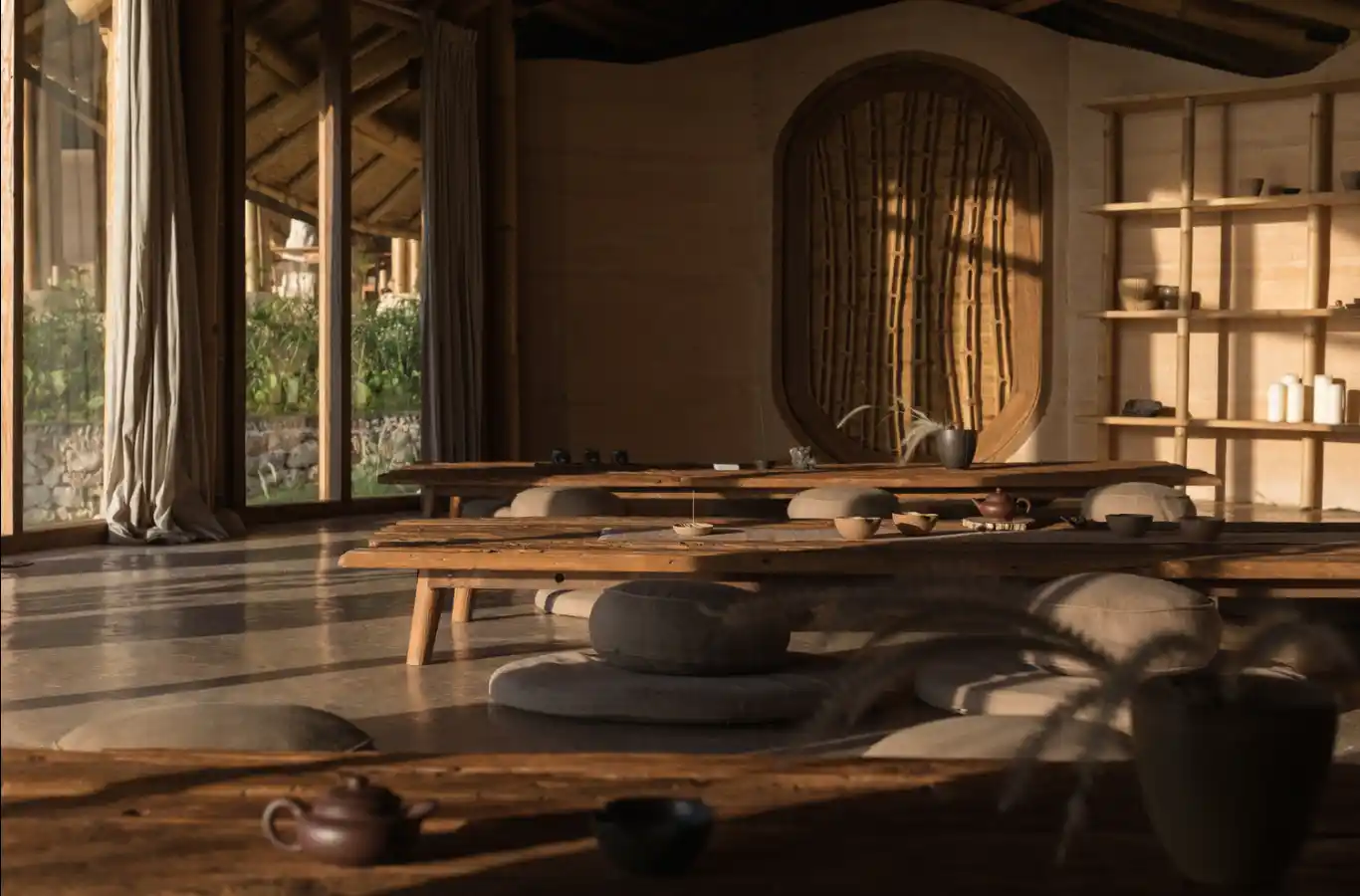 Çatının formu, çevredeki dağların topoğrafik yapısını yansıtarak yerel manzaraya atıfta bulunur. Düzleştirilmiş bambu kiremitlerle kaplanan çatı, kullanıcılarına bir örtü hissi vererek onları korur ve farklı bir deneyime davet eder. Bu mekânda çay, fiziksel, derin ve kişisel duyguların katalizörü olarak işlev görür.