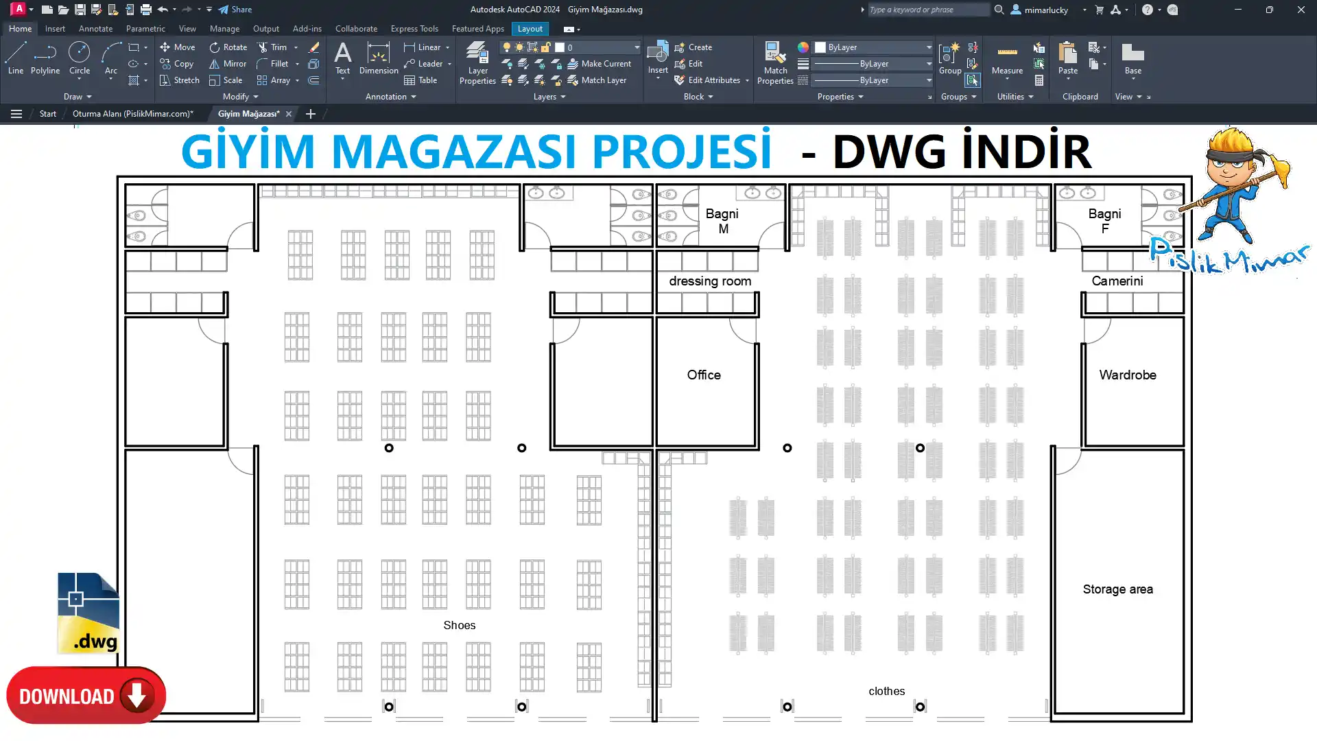 Perakende sektörüne yönelik olarak tasarlanmış bu giyim mağazası projesi, fonksiyonel iç mekân organizasyonu ve kullanıcı deneyimini ön planda tutan plan kurgusuyla profesyonel bir DWG çizim paketidir. Ürün sergileme, müşteri dolaşımı ve satış alanları dengeli bir şekilde planlanmıştır.