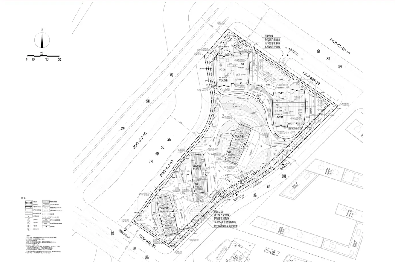 Mimari planlar, beş ofis kulesinin Qiantang Nehri manzarasını en üst düzeye çıkaracak şekilde düzenlendiğini göstermektedir. Kuzeydeki iki kule, üç katlı bir perakende podyumu ile birbirine bağlanırken, güneydeki üç kule, yeşil bir omurga boyunca sıralanmıştır.