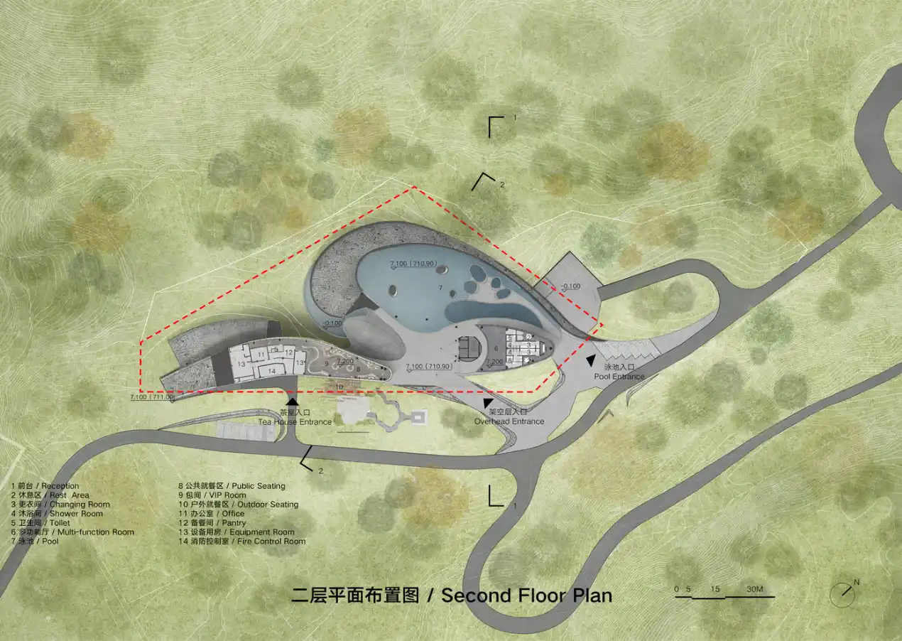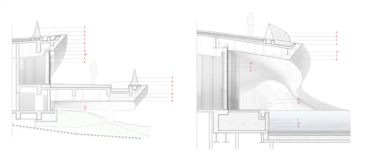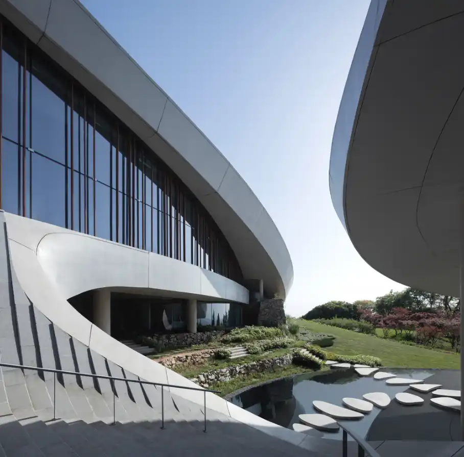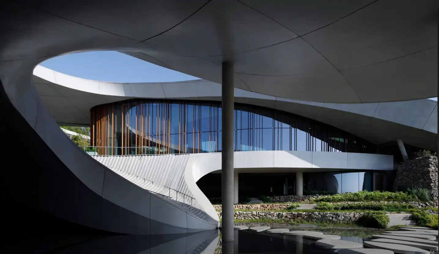 Tasarımda yapay unsurlar kullanılarak geniş manzarayla bir diyalog kurulmuş; böylece bina dağlardan ani bir şekilde yükselmek yerine, topoğrafyaya akıcı bir şekilde yanıt veren, yüzeyden doğan bir parça gibi ortaya çıkmıştır.