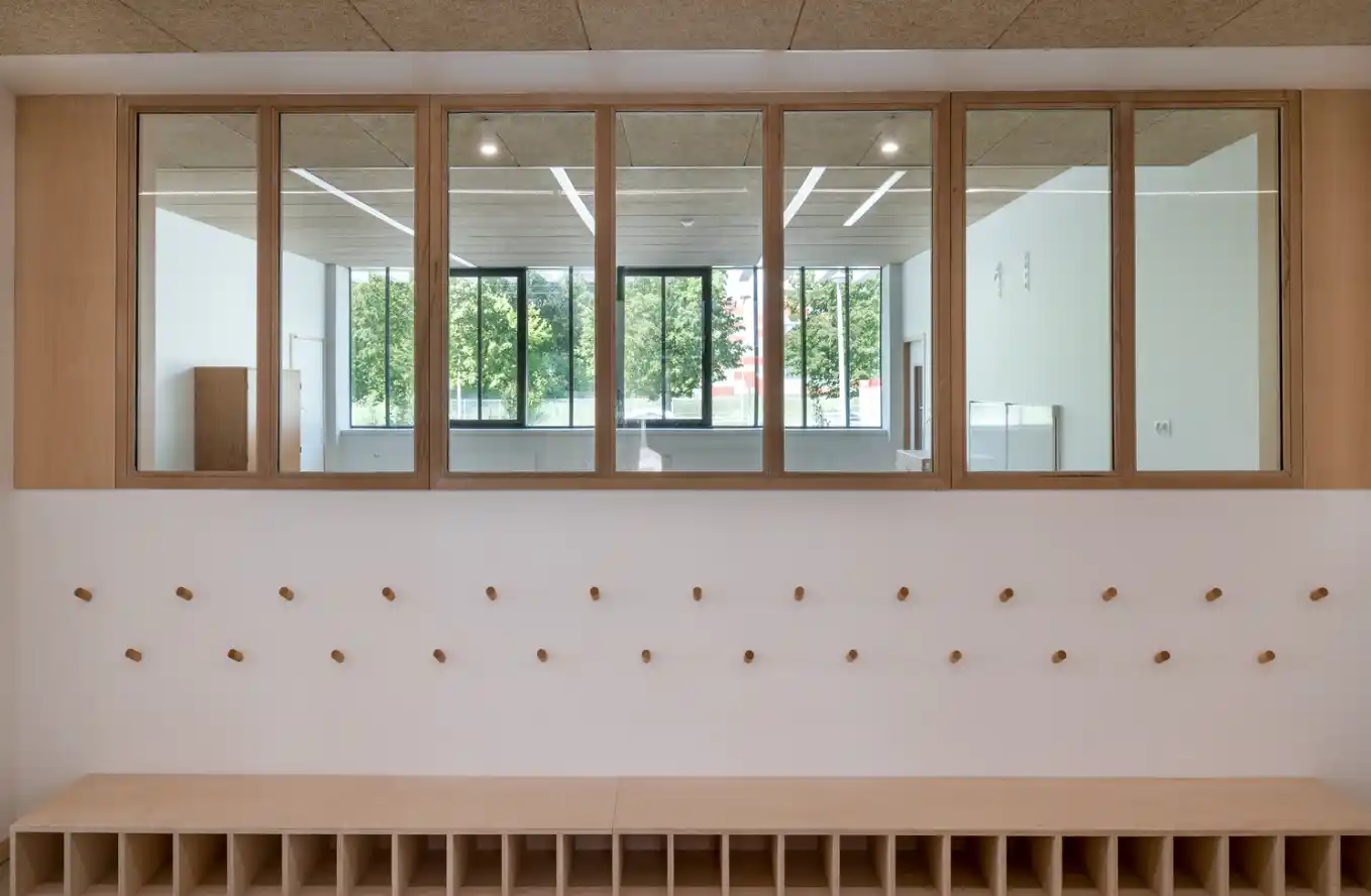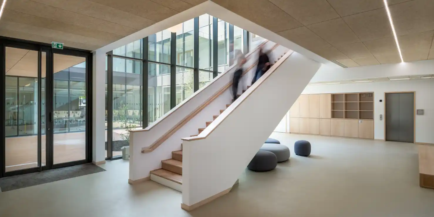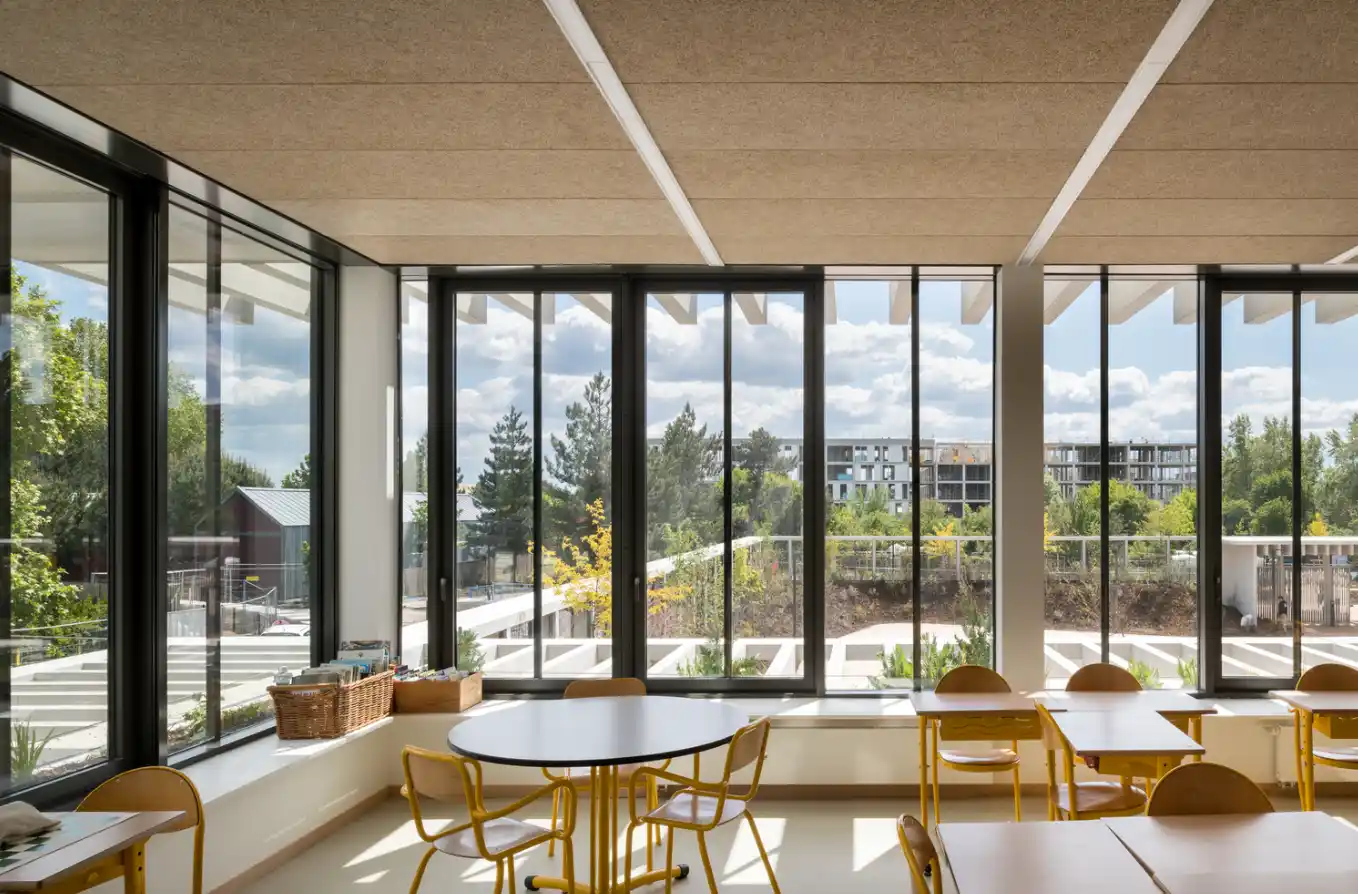 Büyük pencereler, cam paneller ve açık avlular sayesinde sınıflar ve ortak alanlar bol ışık alıyor. Bu sayede yalnızca enerji tasarrufu sağlanmıyor, aynı zamanda öğrencilerin daha rahat ve odaklanmış bir şekilde eğitim alabilecekleri bir atmosfer oluşturuluyor.