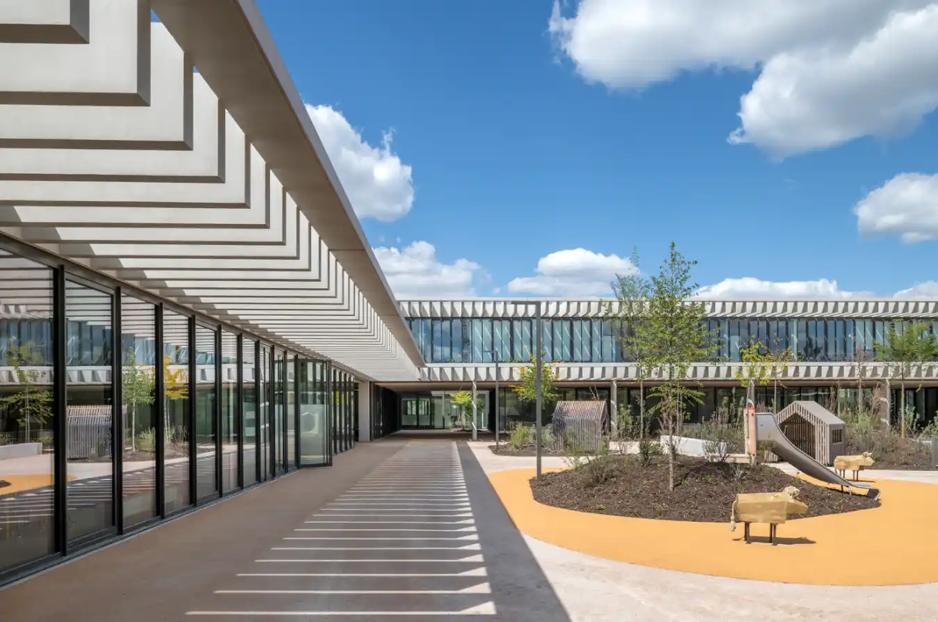 Okul kompleksi, iç ve dış mekânın birbirini tamamladığı bir anlayışla tasarlanmış. Bina içindeki avlular ve dış bahçeler, öğrencilerin ders aralarında rahatlayabileceği, doğayla iç içe olabileceği alanlar sunuyor.