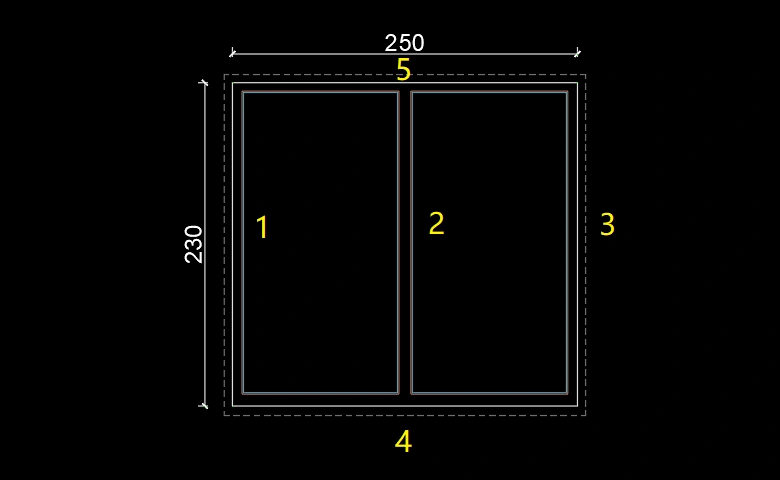 Aşağıda 250 x 230 cm genişliğinde bir alüminyum doğrama çizimi bulunmaktadır. Burada ilk olarak kullanılan Alüminyum doğramaları toplayıp, daha sonraca En x Boy ile cam metrajını çıkartacağız.