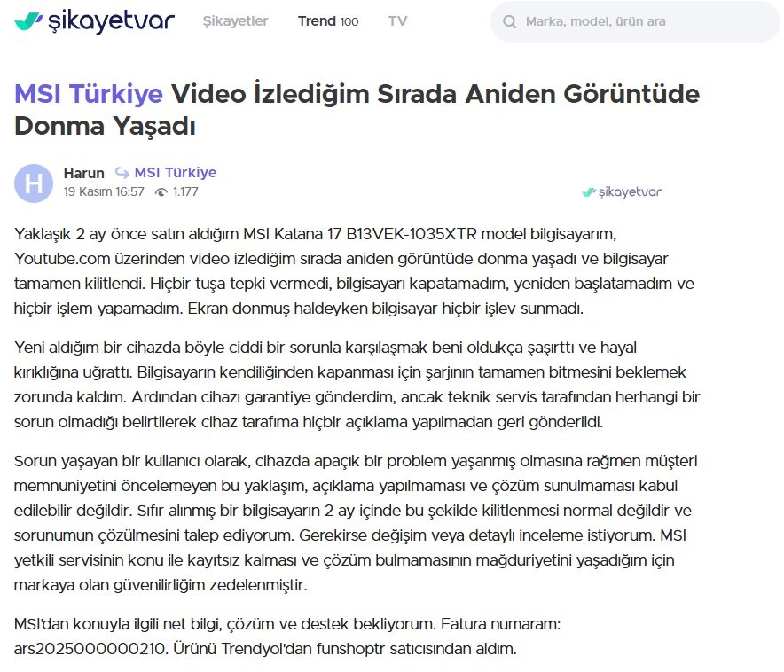 Herhalde driver sorunu var ya da windows kurulumunda hatalar vs. yaptık derken internette araştırmaya başladım. Şikayetim var sitesindeki MSİ Katana ile ilgili şikayetlere denk gelince olm dedik harbiden yarra yedin sen 100.000 TL’en çöpe gidecek