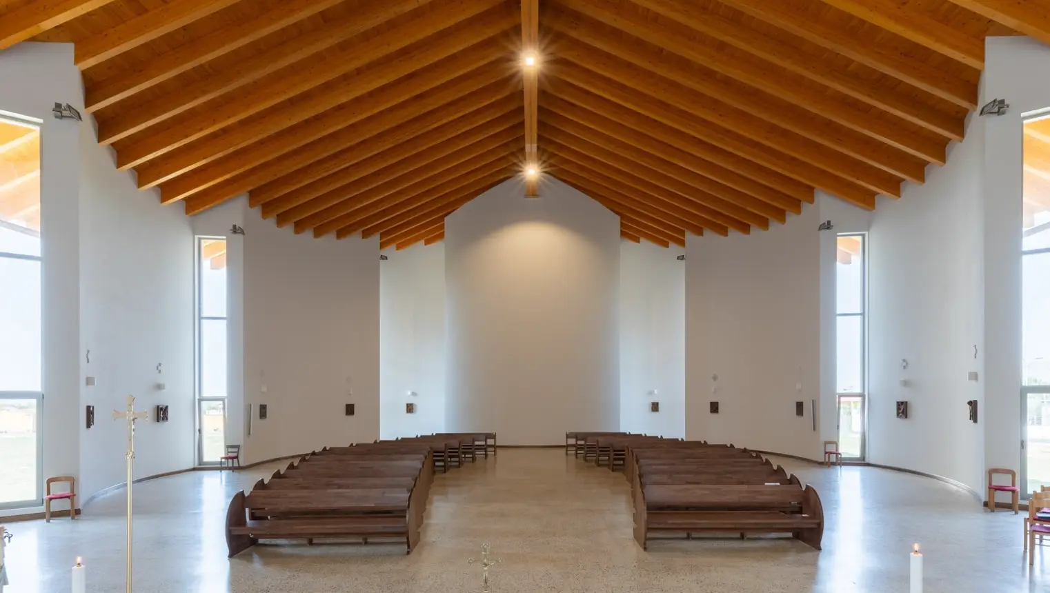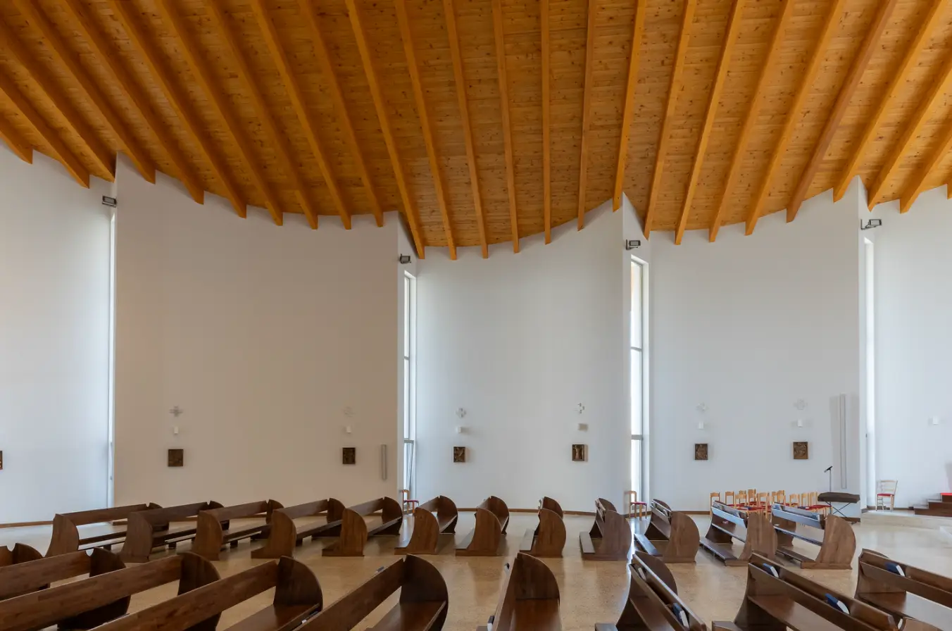 İç mekanın diğer dikkat çekici özelliği ise eğimli zemin tasarımıdır. Altar alanına yaklaşıldıkça zemin hafifçe alçalır, bu da bir manevi küçülme hissi yaratır. Bu özel tasarım, inananların kutsal alana doğru yönelirken duygusal ve psikolojik bir dönüşüm yaşamalarını amaçlar. Sıcak ağaç malzeme kullanımı, duvarlarda ve tavanda ahşap unsurlar ile mekânı sıcak ve davetkar kılar. Ahşap tavan, limon yaprağının saf ve temiz dokusu gibi tasarlanmış olup, sıcak ve organik bir atmosfer yaratır.