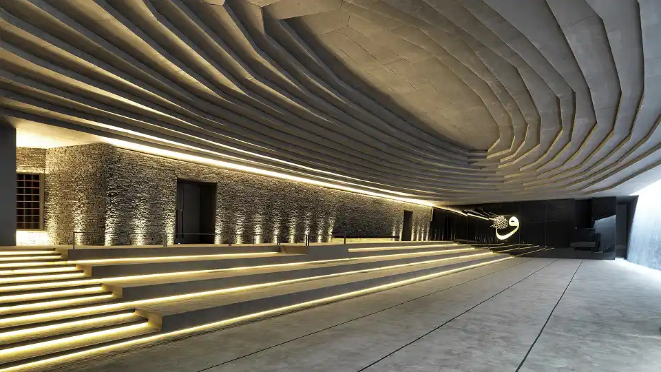 İç mekânda, kıble duvarı boyunca uzanan yarıklar ve kırıklar, namaz alanının yönlülüğünü vurgular ve gün ışığının namaz salonuna süzülmesine olanak tanır. Bu tasarım detayı, mekâna hem estetik bir değer katar hem de ibadet edenlerin kıble yönünü daha derinden hissetmelerini sağlar.