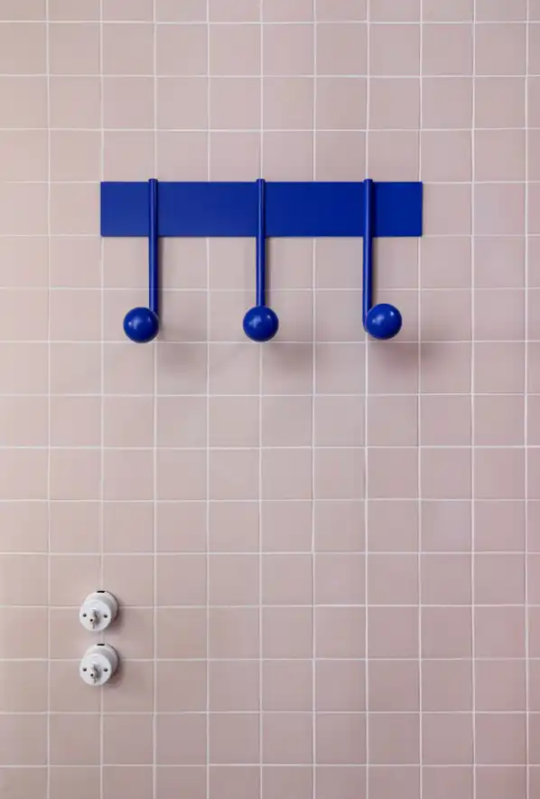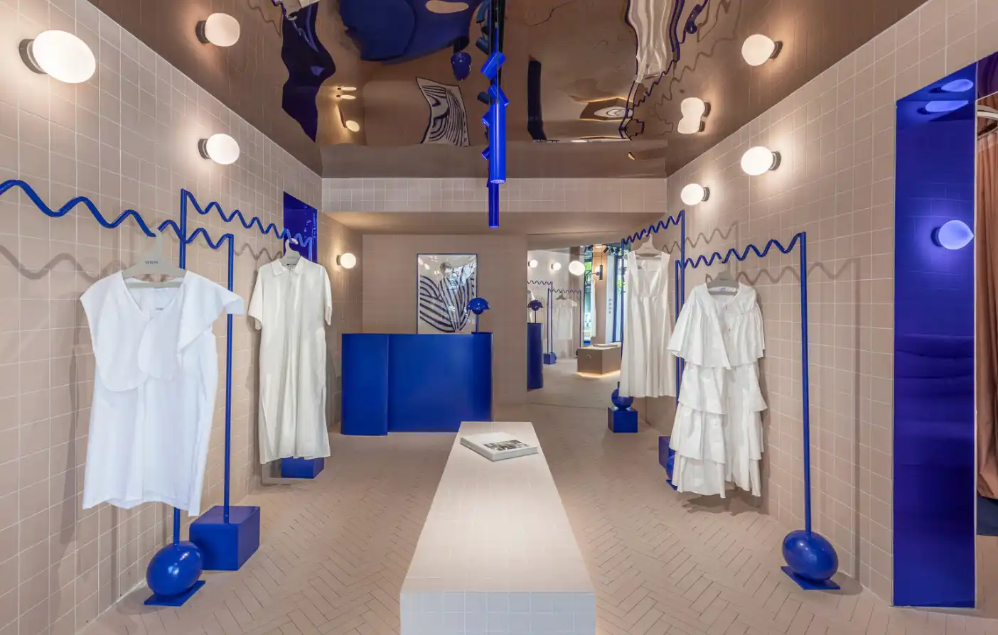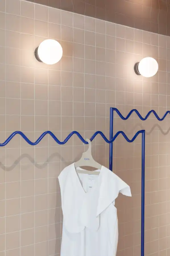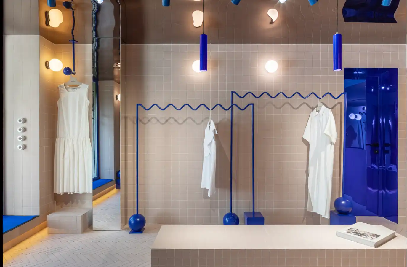 Akıcı bir atmosfer sağlamak için metal mobilyalar duvarlardan bağımsız tasarlanmıştır. Kıyafet askıları, dalgalı metal çubuklardan yapılmış olup, bu dalgalar sergilenecek ürün sayısını sınırlayarak mekânın sade havasını korur.
