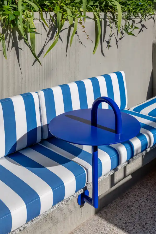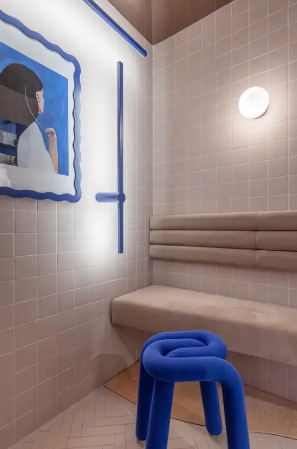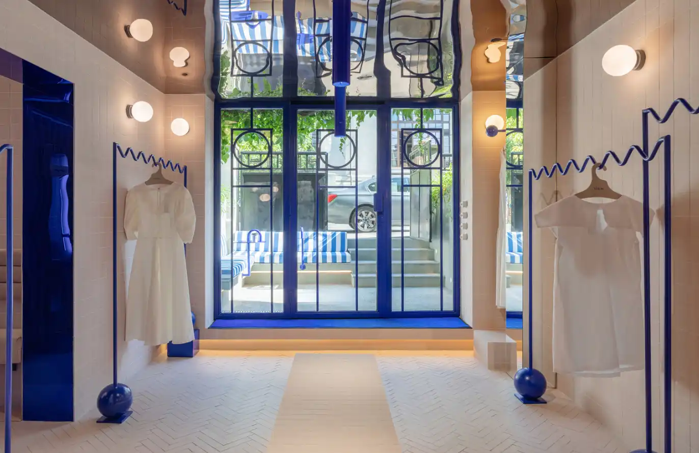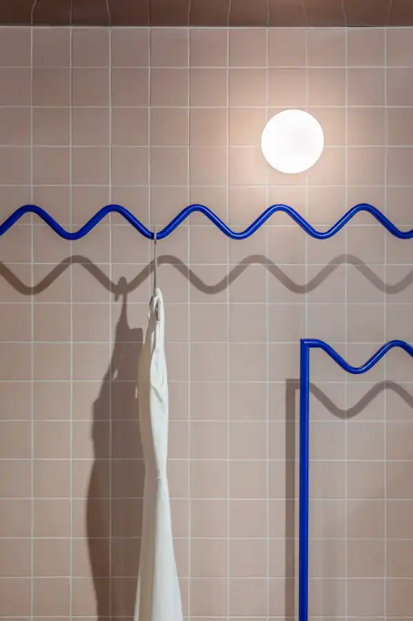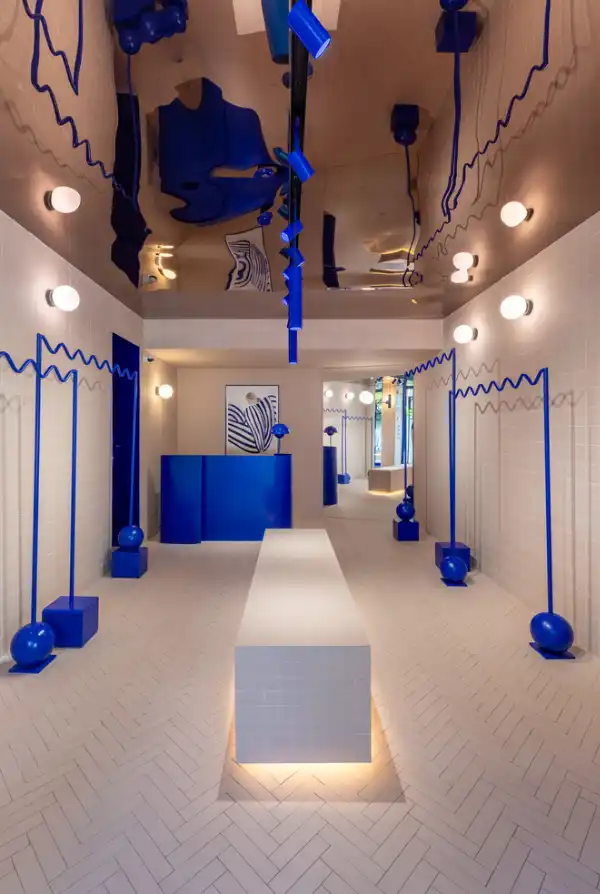 Resepsiyon masası, tezgâhı saran mavi metal bir levhadan yapılmış ve duvarlardan bağımsızdır. Deneme kabini bile, etrafı perdeyle çevrili, serbest duran bir ayna düzeninden oluşan bağımsız bir unsurdur.