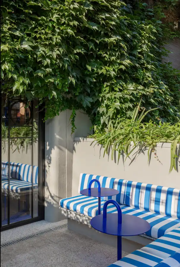 Yıkılmış erişim rampası kaldırıldığında, mevcut bahçe saksılarıyla çerçevelenmiş ve kaldırımdan zemin seviyesi farkıyla korunan küçük bir avlu oluşturulmuştur. Bu şekilde, mağaza mahalleye açılarak tanıdık bir atmosfer sunar.
