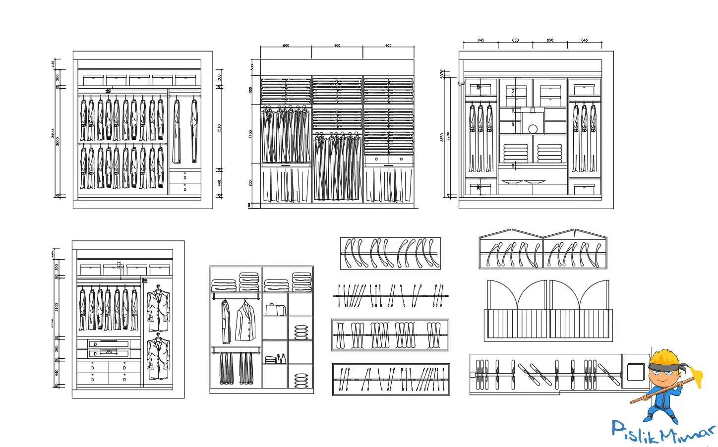 Vestiyer Dolabı DWG (Wardrobe Cad Blocks) AutoCAD çizimleri. Vestiyer dolabı, giriş alanlarında mont, ceket, ayakkabı ve günlük eşyaların düzenli bir şekilde saklanmasını sağlayan fonksiyonel bir mobilyadır. Genellikle askılık, raf, ayna ve ayakkabılık bölümlerinden oluşur. Antre ve hol gibi alanlarda hem düzen hem de estetik görünüm sağlar.