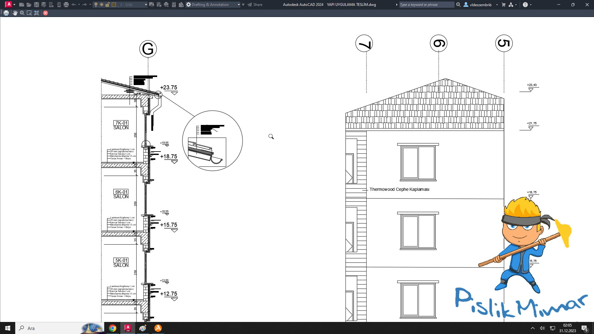 Görünüş çizimleri içerisinde kırma çatıya ait çatı görünüş çizimi, hatch çatı taraması, cephede kullanılan malzemeler ve kat kotlamalarıyla beraber çizilmiştir. Görünüş çiziminin detayına aşağıdaki resim üzerinden ulaşabilirsiniz.