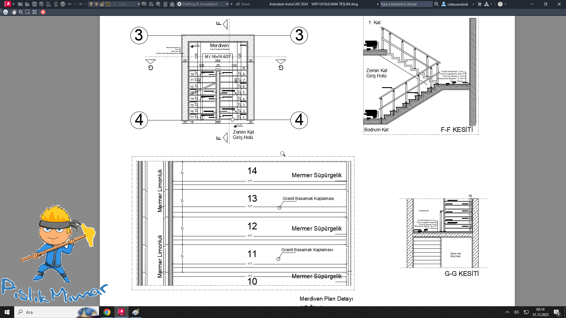 Mimarlık ve İç Mimarlık okuyan arkadaşlar için çizilmesi en zor olan Merdiven Kesitine ait full paket aynı proje içerisinde yer almaktadır.